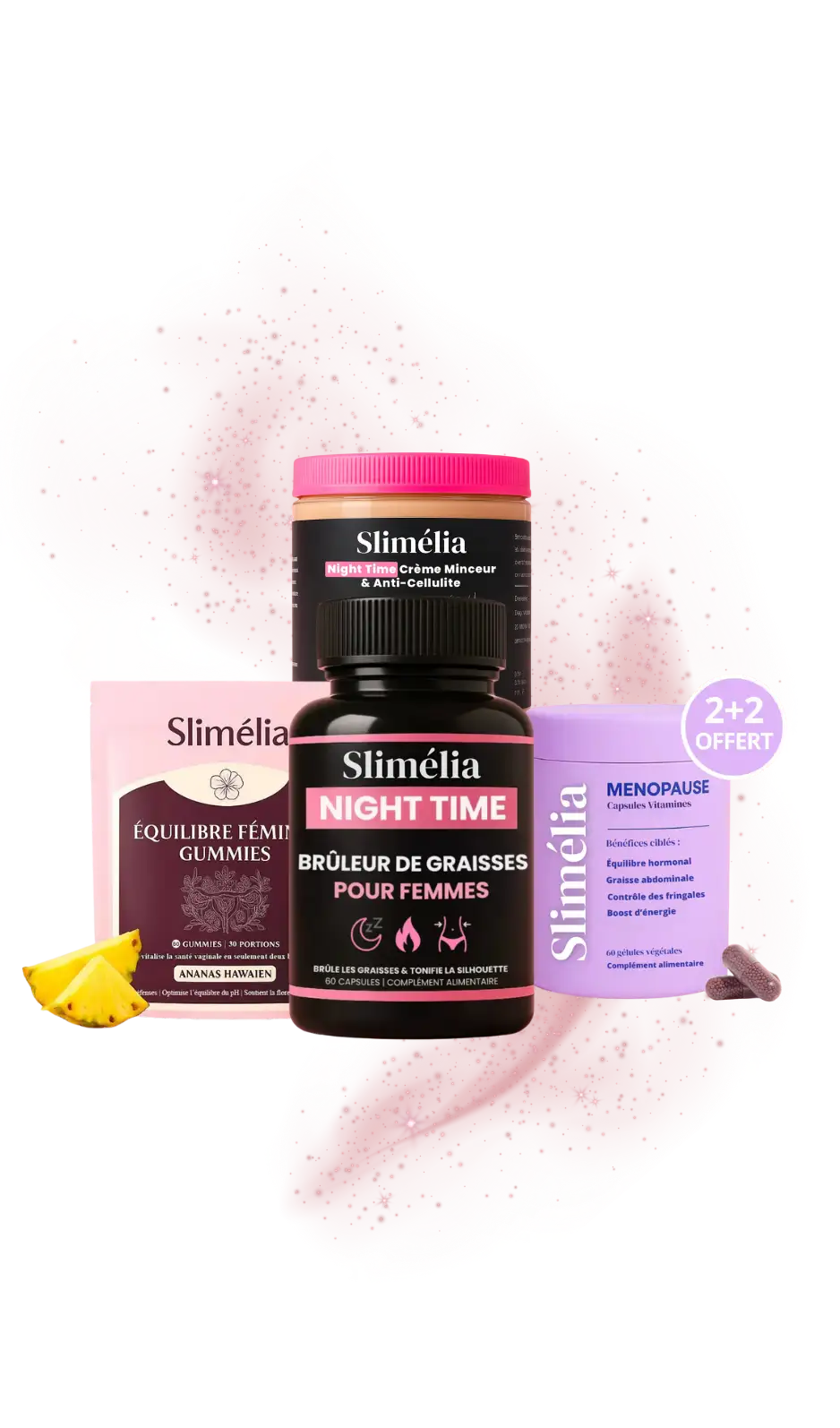 C’est pourquoi Slimélia propose des produits ciblés : brûleurs de graisses nocturnes, soins anti-cellulite, compléments pour la ménopause ou l’équilibre féminin.